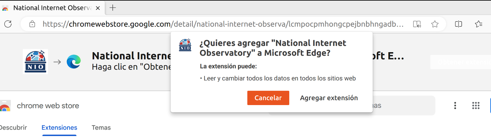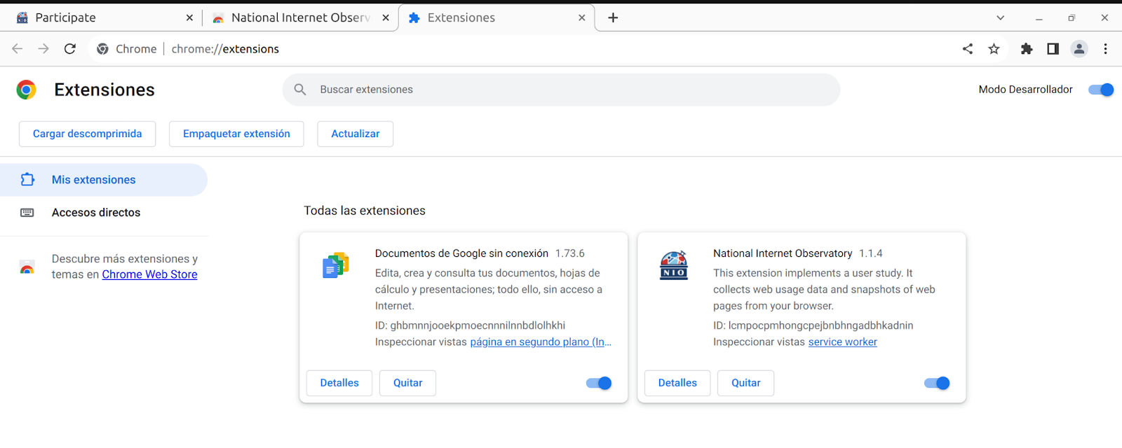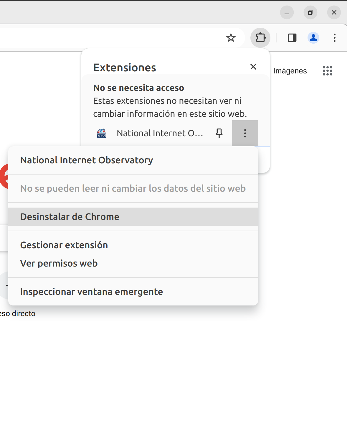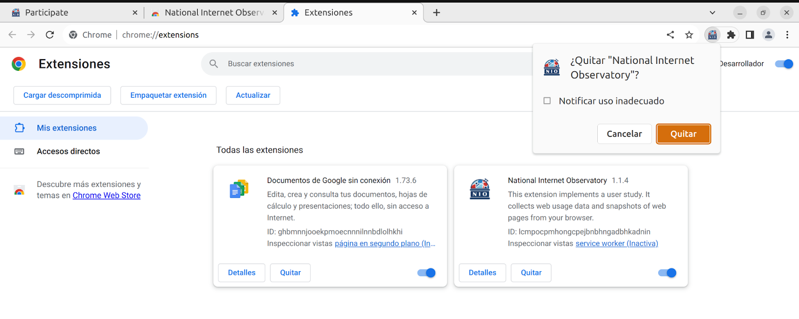 En el administrador de extensiones, busque la "Extensión del Navegador del National Internet Observatory" y haga clic en el botón Quitar.