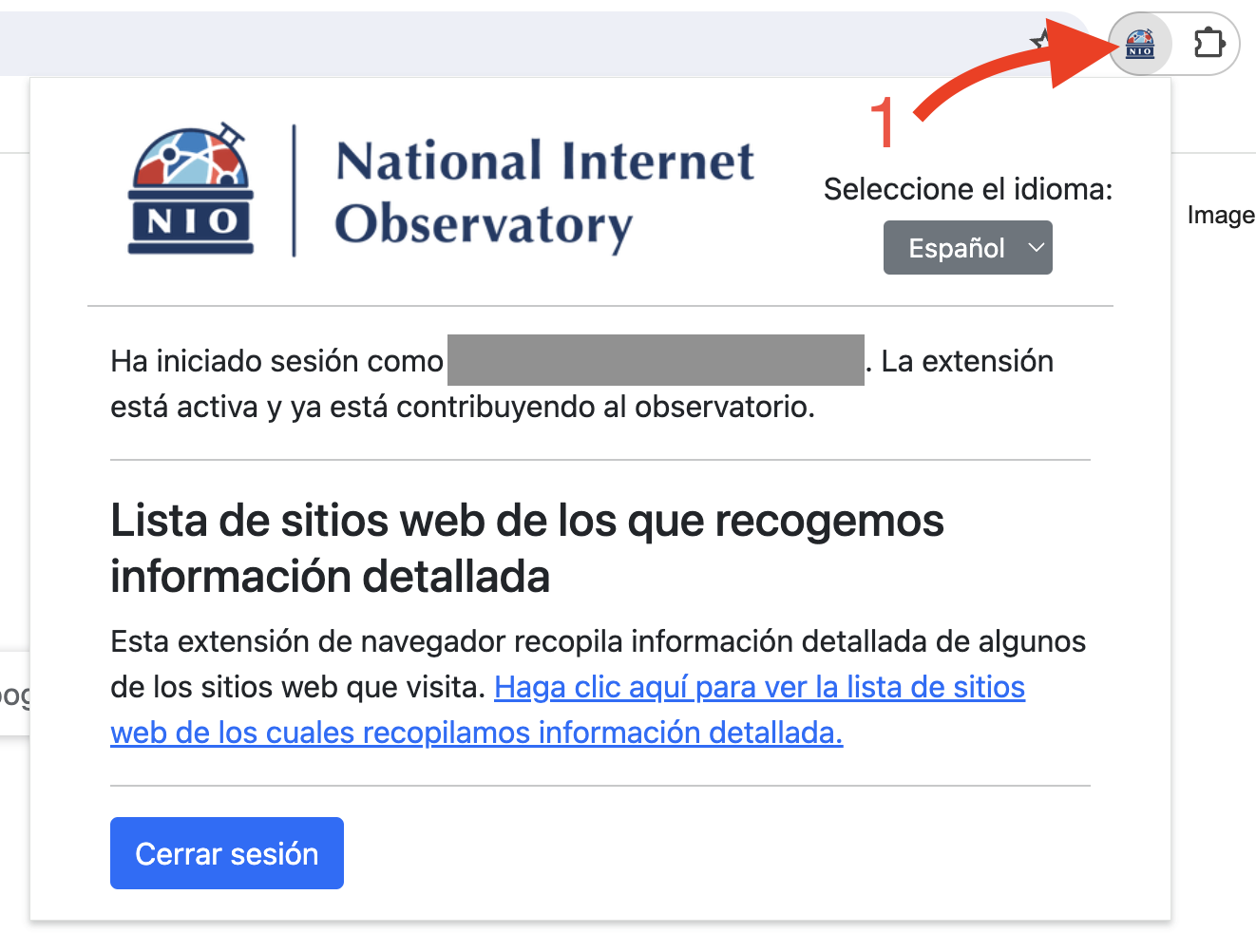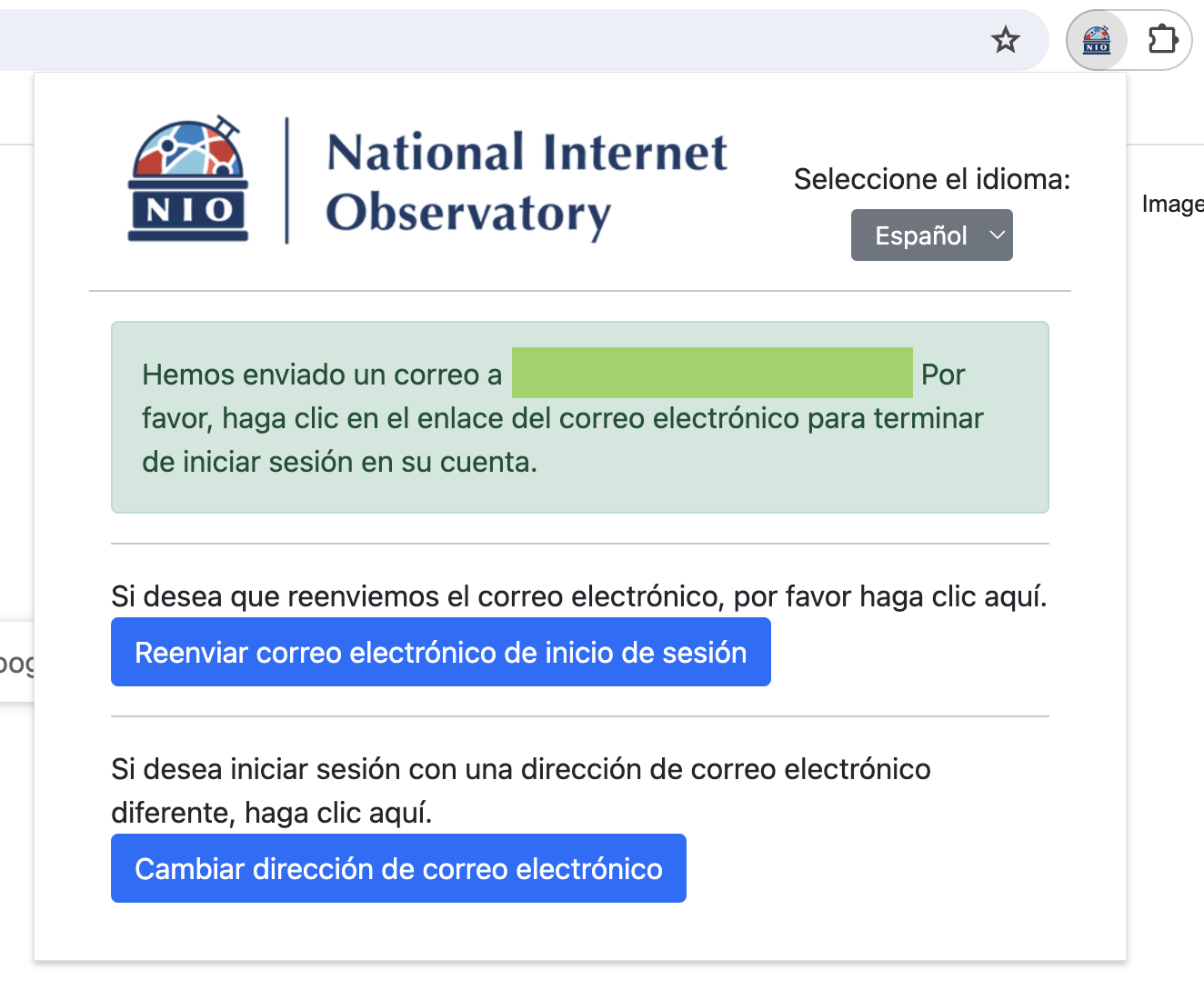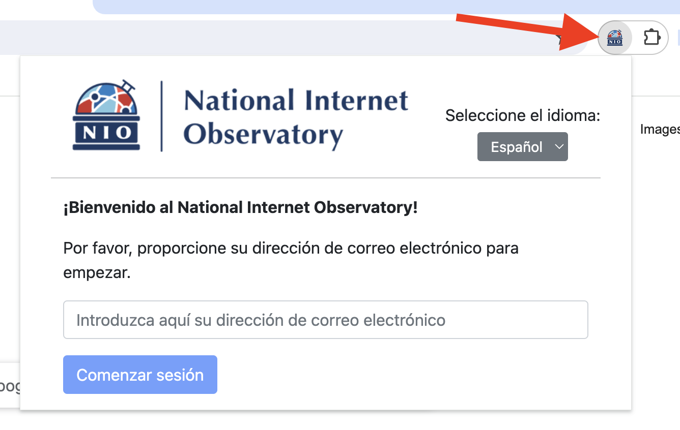 Después de instalar la extensión, debe iniciar sesión. Ingrese su dirección de correo electrónico en el menú de la extensión y haga clic en el botón de inicio de sesión. Tenga en cuenta que debe ingresar la misma dirección de correo electrónico que utilizó al dar su consentimiento al National Internet Observatory.