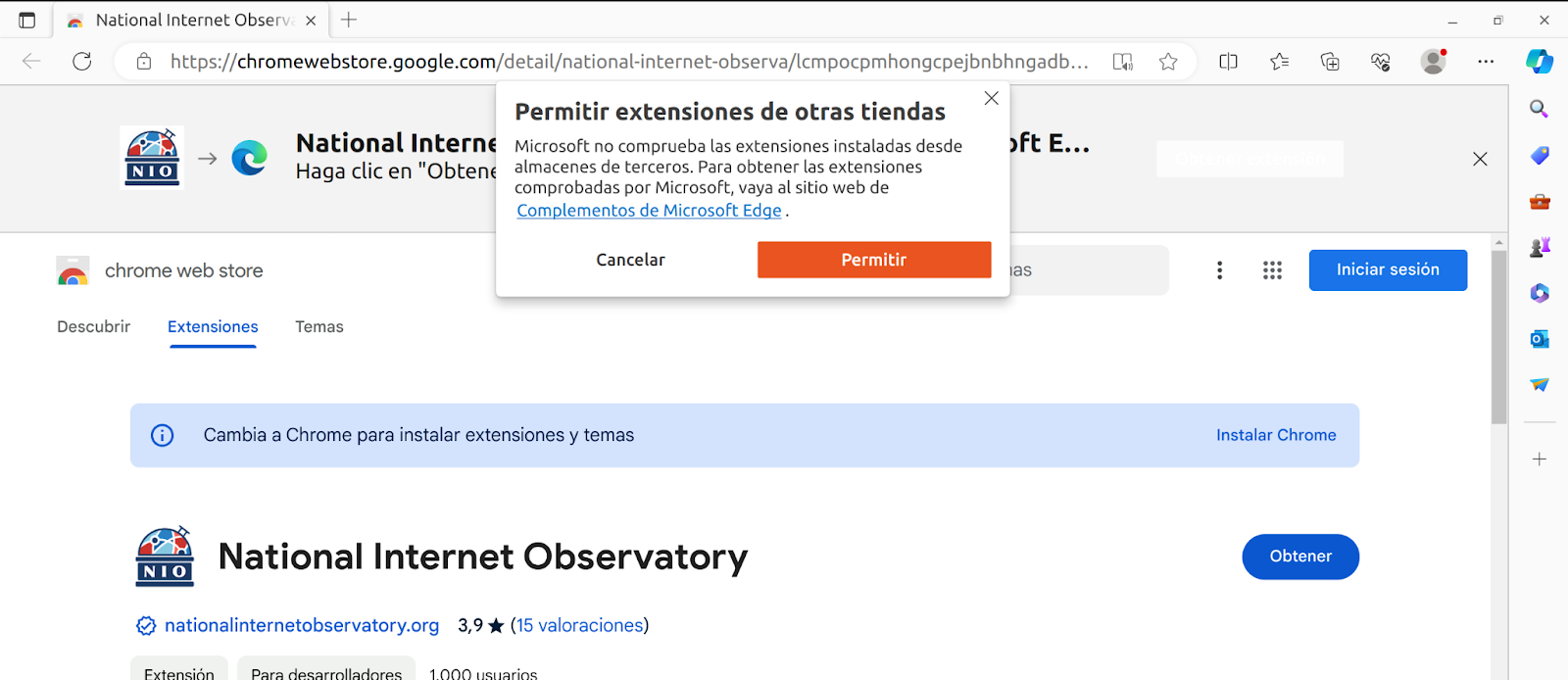 Importante: Si usted usa Microsoft Edge, puede que tenga que habilitar la opción de añadir extensiones de la Chrome Web Store. Puede hacer esto clicando sobre el botón de “Permitir extensiones de otras tiendas” en el aviso azul que aparece en la parte superior de la Chrome Web Store