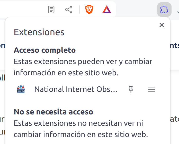 Se abrirá un menú que mostrará las extensiones instaladas en su navegador. Nuestra extensión, el "National Internet Observatory", debería aparecer en la lista. Haga clic en el icono del alfiler que aparecerá junto a nuestra extensión para fijarla a la barra de herramientas de su navegador.