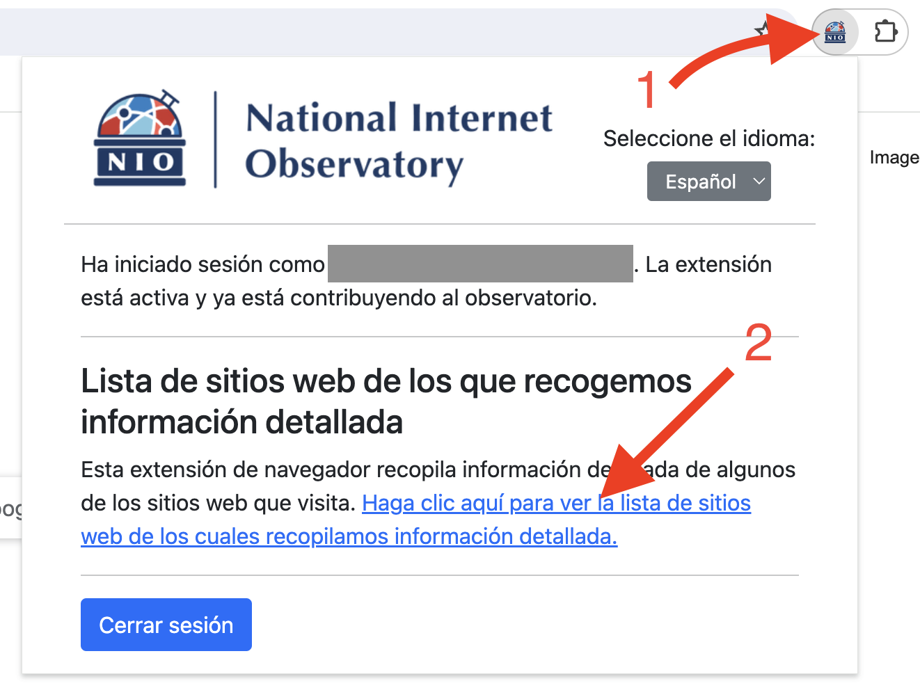 En cualquier momento, usted puede ver la lista de sitios web para los cuales la extensión está recopilando estas capturas. Haga clic en el ícono de NIO a la derecha de la barra de direcciones de su navegador para abrir el menú desplegable de la extensión, luego haga clic en el enlace para ver la lista de sitios web para los que recopilamos las capturas.