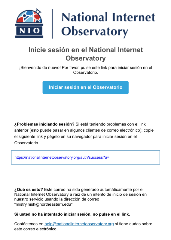 Haga clic en el botón "Iniciar sesión en el Observatorio" en el correo electrónico para completar el proceso de inicio de sesión. Nota: si tiene problemas para hacer clic en el botón "Iniciar sesión en el Observatorio", puede copiar el enlace proporcionado en el correo electrónico y pegarlo en la barra de direcciones de su navegador.