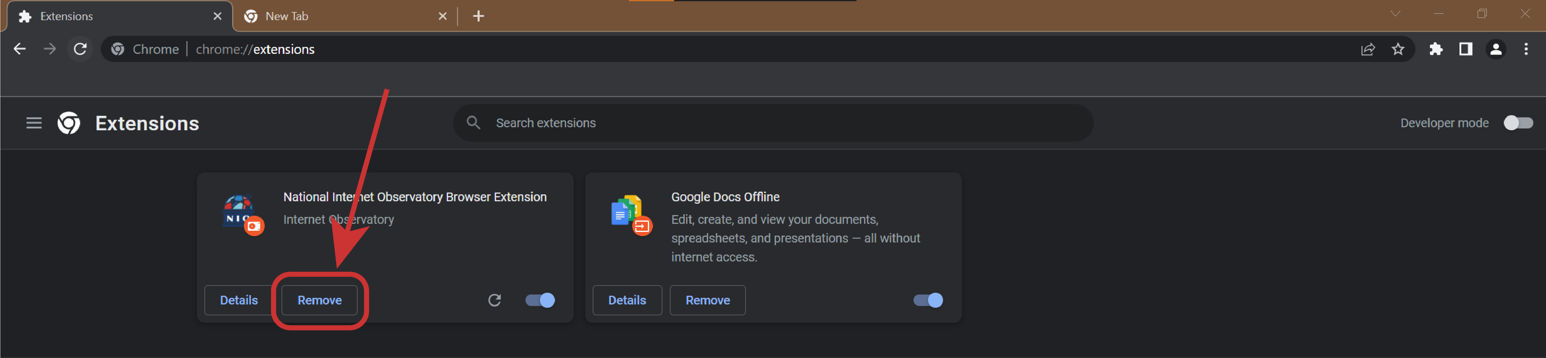 In the extension manager, find the "National Internet Observatory Browser Extension" and click the Remove button.