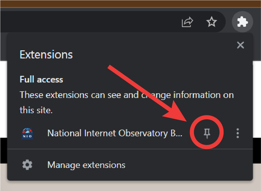 A menu will open showing the extensions that are installed in your browser. Our extension, the "National Internet Observatory", should appear in the list. Click the pin icon next to our extension to pin it to your browser's toolbar.