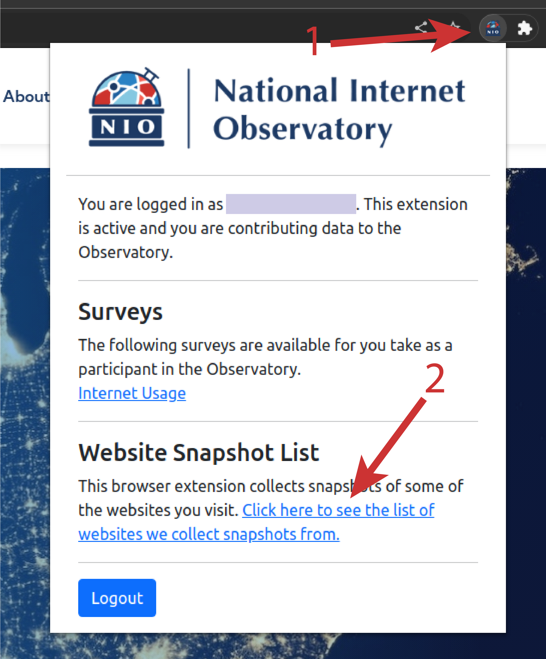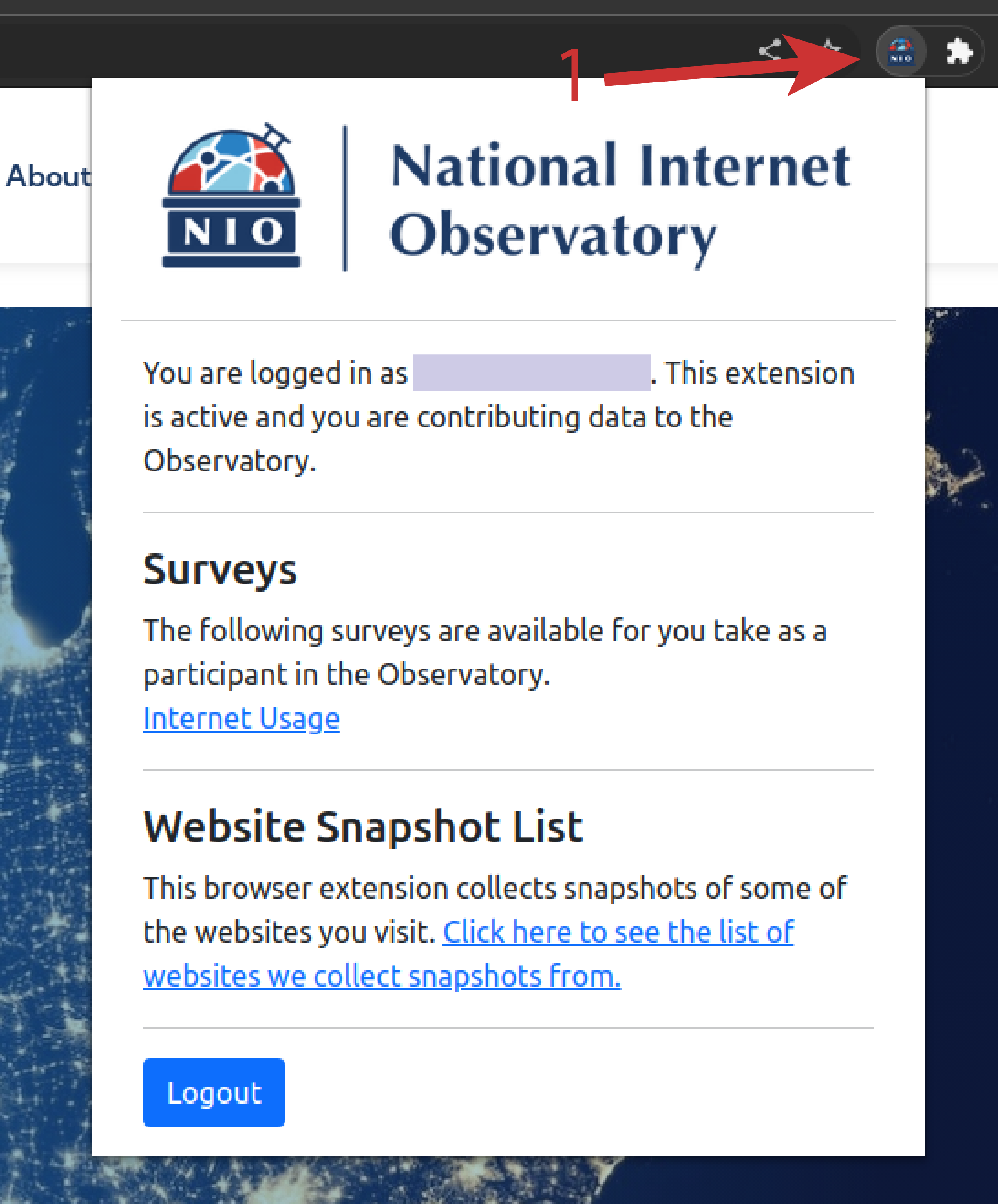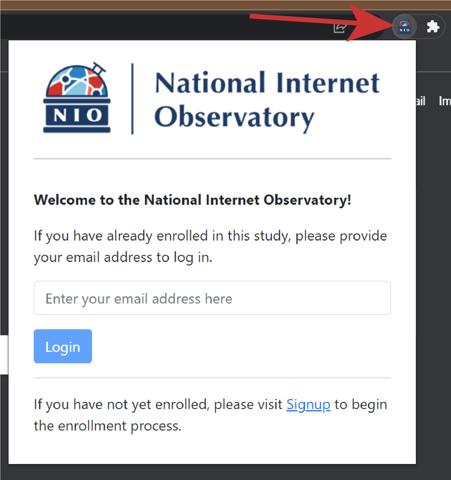After you install the extension you must login. Enter your email address into the extension's menu and click the Login button. Note, you must enter the same email address you used when you consented to the National Internet Observatory!