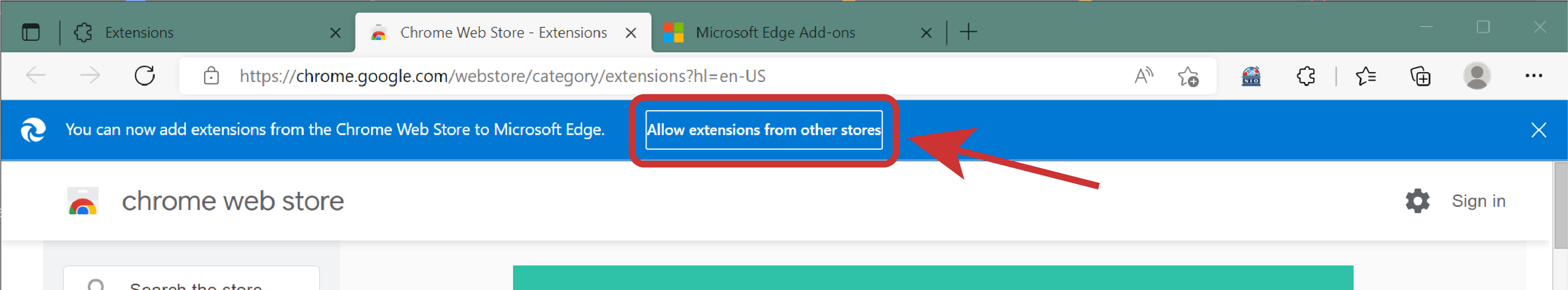 Important: If you use Microsoft Edge, you may need to enable extension installation from the Chrome Web Store. You can do so by clicking the Allow extensions from other stores button in the blue band at the top of the Chrome Web Store web page.