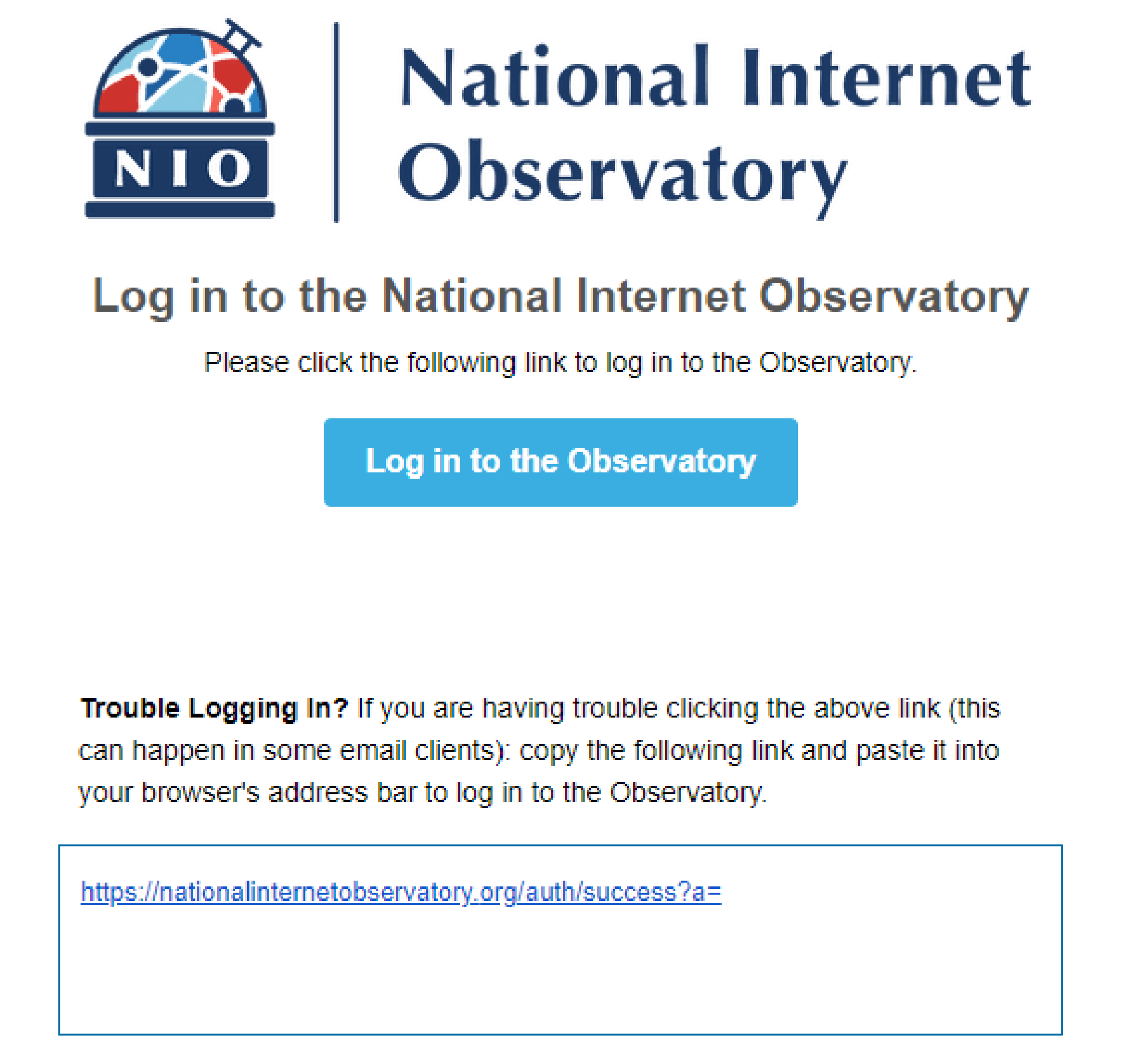 Click the Log in to the Observatory button in the email to complete the login process. Note: if you are having trouble clicking the Log in to the Observatory button, you can copy the login link from the email and paste it into your browsers' address bar.